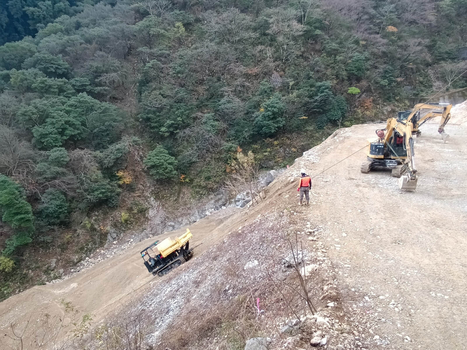 セーフティーキャリアクライマー工法(SCC)は、斜面無人運搬機「キャリアクライマー」を用いて、斜面での運搬作業をリモコン操作で無人化した新しい工法です。さらに、独自のワイヤロープ設置方法により仮設物が不要となり、施工までの準備期間の大幅な短縮を実現しました。