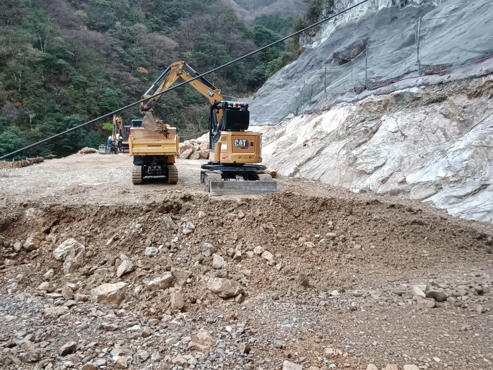 斜面で土砂や資機材を安全・迅速に運搬する無人化工法です。